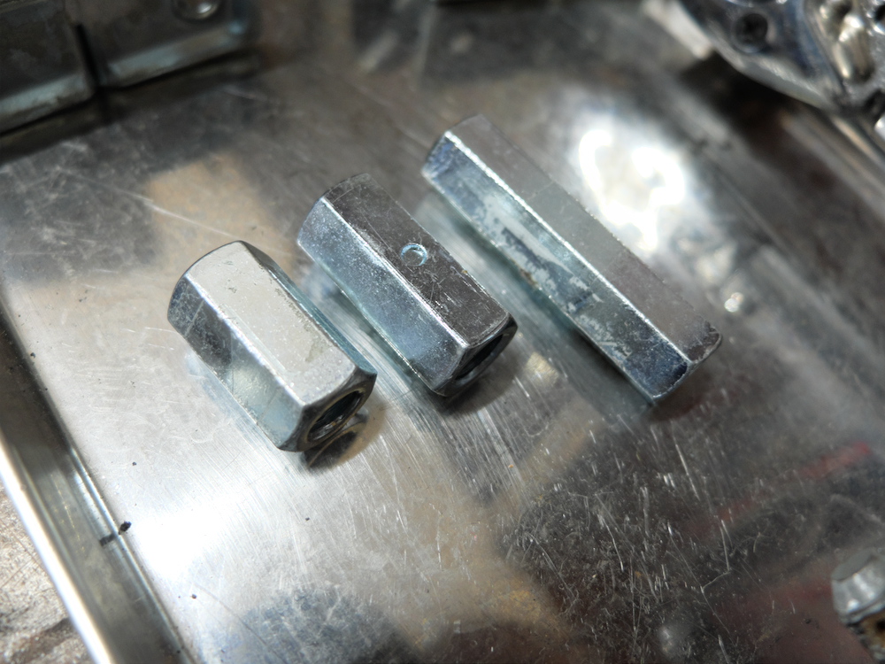 タイヤを外しハンドルも邪魔なので撤去。フォークのトップボルトを見ると15mm程のどでかい六角で、そんな工具は持っていない。15mmのヘキサなんて他ではまず使わないし、合いそうな長ナットを数種買ってくる。