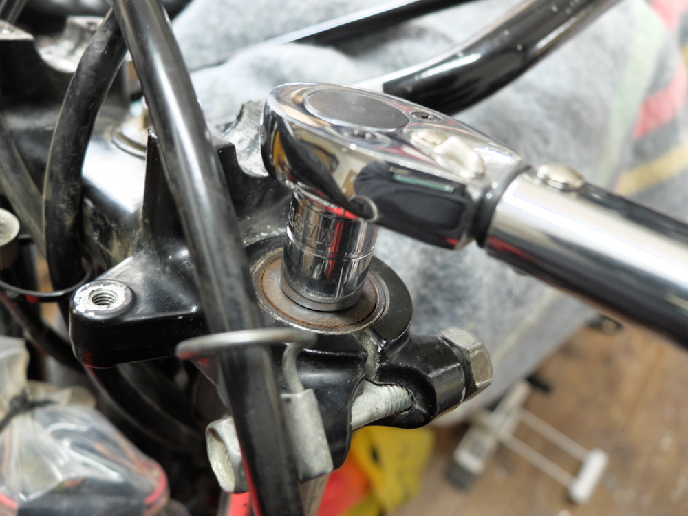 トップボルトを緩めたらフォークを抜いて、あらためてゆっくりボルトを外す。