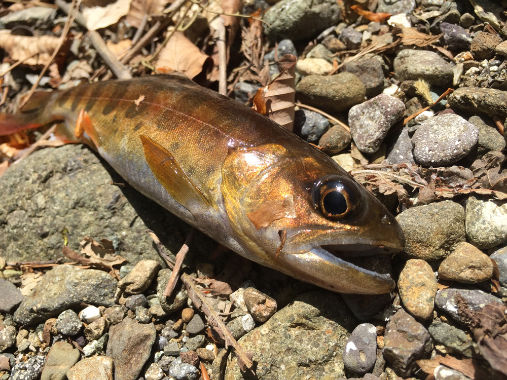 もともとテンカラは職業としての漁なのだ。いくら釣りづらい状況であれ、数匹は持ちかえらねばおまんま食い上げだ。だから僕のような下手っぴでも、うまくすればこんな黄金色のヤマメだって釣ることができる。
