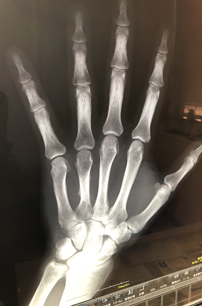 ちょうど一年前、通い慣れた道志川支流のテンカラ釣りで、バランスを崩して手をついた拍子に左手中手骨を骨折した。このレントゲンはだいぶくっついてからのもの。