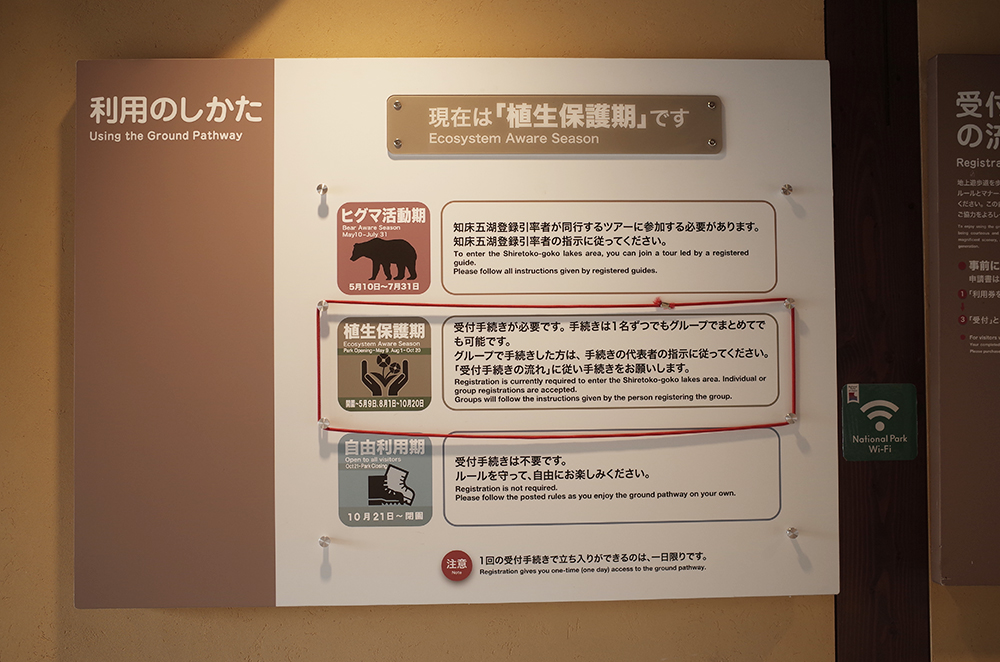 時期によってガイド引率の「ヒグマ活動期」と、レクチャーを受けて個人で行く「植生保護期」と、手続き不要で自由に動ける「自由利用期」とあるらしく、今は植生保護期なのでレクチャー受けたら個人で行ってね、という時期だった。