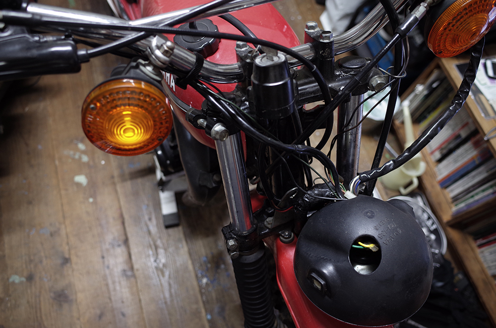 配線は知恵の輪状態。マーキングしてた文字が消えかけてて霊感で繋ぐ。試走できれば良いのでメーターは省略。久しぶりに見たみかんウインカーは良いなあ。