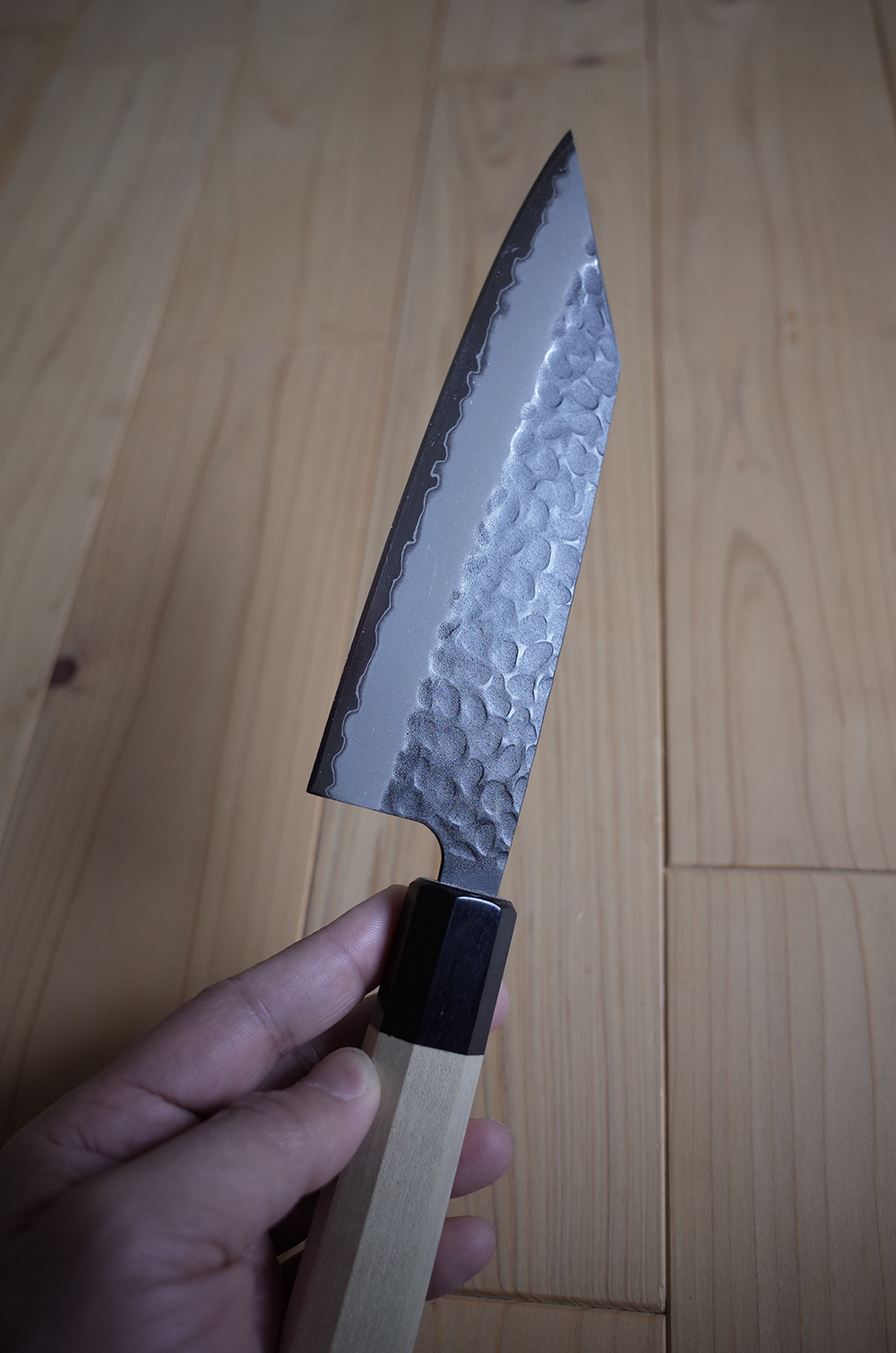 刃身は青砥スーパー黒打、柄は和包丁のような白系に憧れていたので、八角水牛口輪柄に付け替えてもらう。黒打刃とのコントラストが美しい。